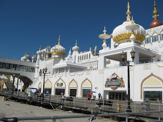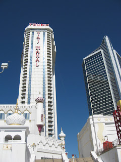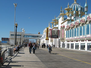 C’est samedi matin, le boardwalk est plein de monde, les gens font comme nous et profitent de cette belle journée d’automne. La mer est agitée, il y a de belles grosses vagues qui roulent sur la plage, nous admirons l’habilité des surfers qui les dominent avec adresse. On se croirait sur la strip de Las Vegas (en plus petit), nous retrouvons les même hôtels, le Tropicana, le Trump, le Caesar, le Bally, le Harry, et autre.