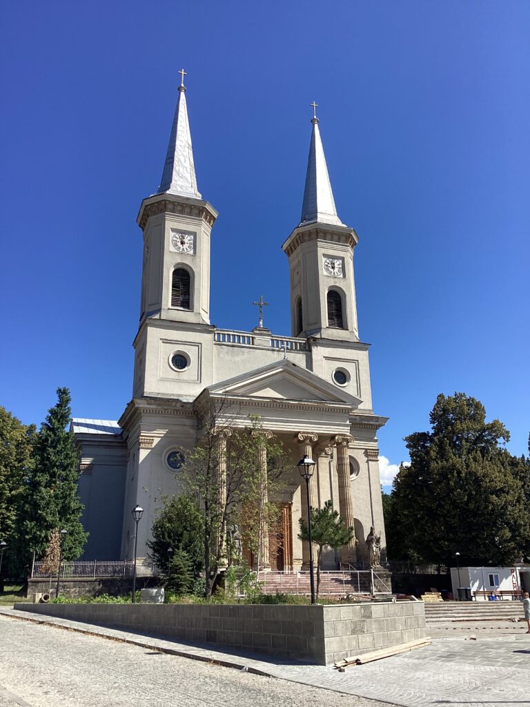Non il n’y a pas d’église en bois, mais il y a bien une église qui nous a interpellé, avec ces quatre immenses collones romaines dans sa façade.