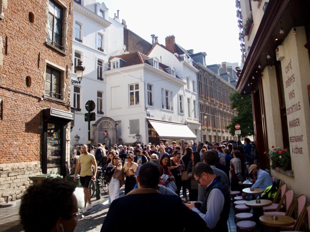 Ha! y a bien un autre endroit qui est très populaire en ville, qu’il nous fallait ne pas manquer, il est peut-être plus populaire que la Grande Place, c’est le « Manneken Piss ». Le petit pisseux.