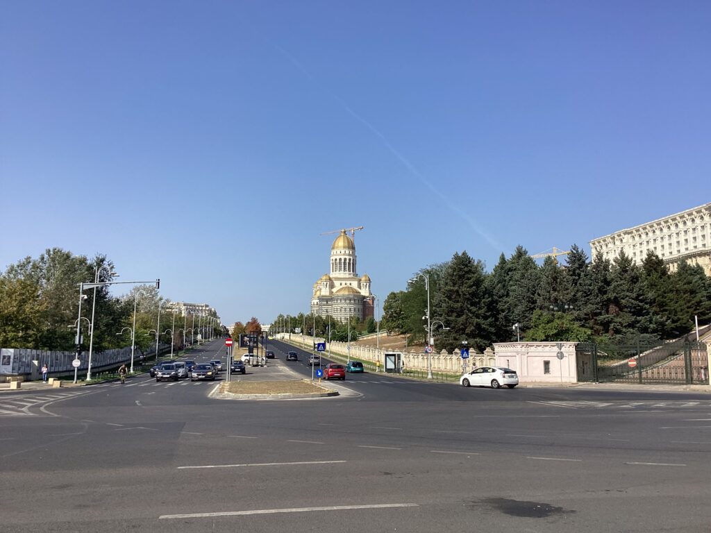 Le dôme doré que nous voyons au loin, c’est la Cathédrale du Salut de la Nation, c’est la plus grande église de Roumanie et l’une des plus grandes églises orthodoxes du monde. La première pierre a été posée en février 2011 et sa date d’achèvement était prévue pour fin 2018, mais elle n’est toujours pas terminée, fin des travaux prévue pour 2025.