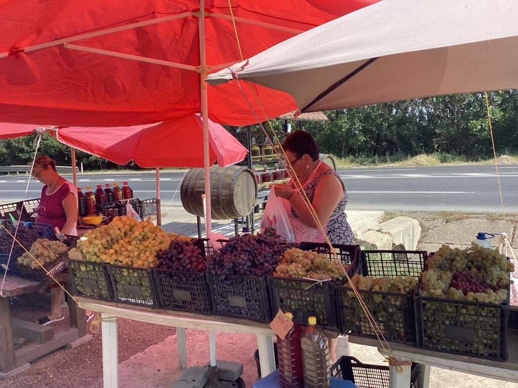 Il y a beaucoup de culture maraîchère, tomates, concombre, oignons, patates, aubergines, poivrons et autres, et en campagne tout le monde a son jardins. Pour se qui est des fruits, c’est pareils, prunes, poires, raisins et pommes, bons et frais, surtout les pommes il y en avait partout, on les cueillaient à même les arbres le long des routes.