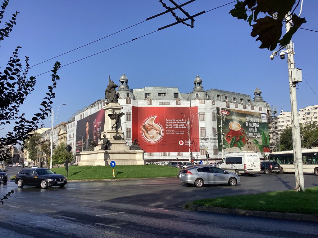 Les derniers jours passés à Bucarest nous ont permis de faire de belles découvertes, de voir de surprenants édifices. Ce n’est pas ce qu’on peut appeler une belle ville, les gros édifices appartements sont gris et vétustes, rare sont les maisons où bâtisse de couleur. Les panneaux publicitaires sont partout et souvent affichés en grand sur les façades d’édifices, les murs sont recouverts de graffitis et d’affiches de tout genre.