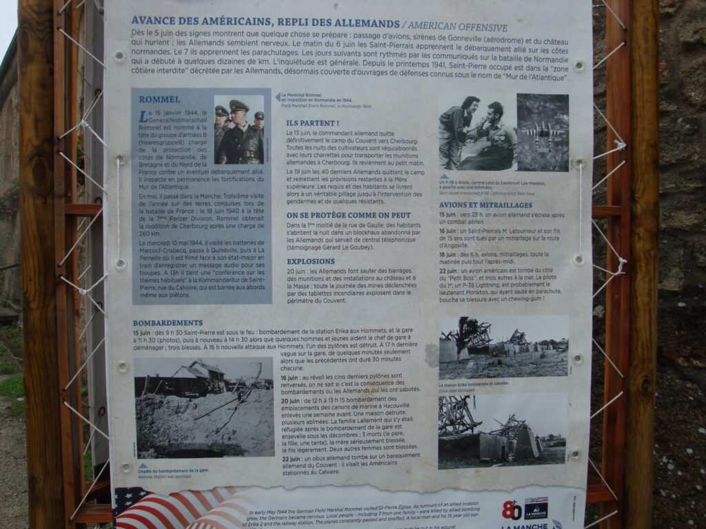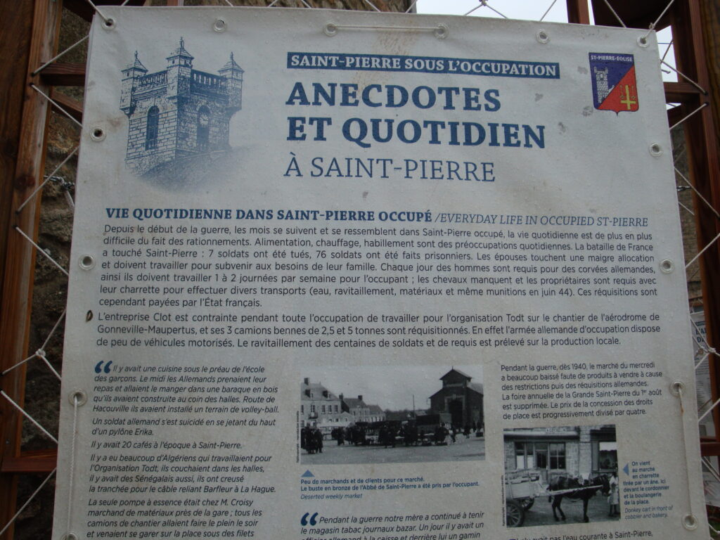 Saint-Pierre-Eglise a beaucoup d’histoire concernant l’occupation allemande. Ce soir je suis un peu paresseux, plutôt que de vous les raconter (se serait trop long) j’ai photographié les panneaux d’informations et à vous de les agrandir pour les lires (si ça vous tente).