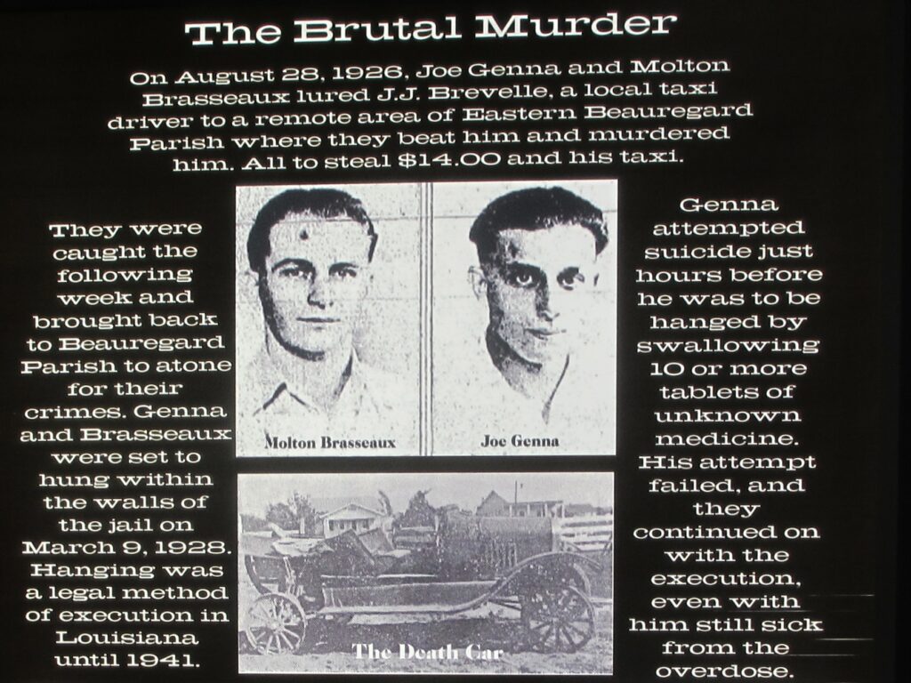 Le 28 août 1926 Genna et Brasseur ont battus à mort, J.J. Bretelle chauffeur de taxi local pour lui voler la somme de $14.00.