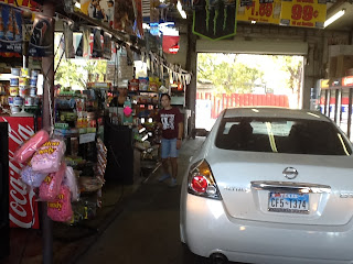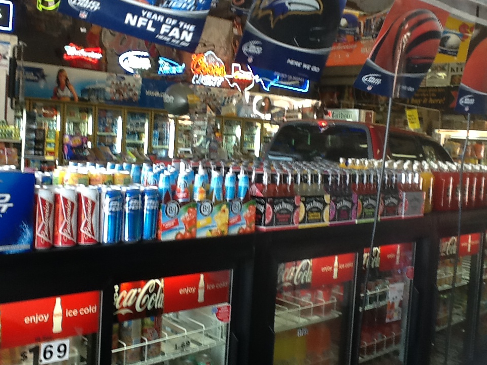 Le véhicule a seulement a entrer en longeant les armoires, et une jeune dame lui remet se qu’il veut, il paie et il ressort sans mettre le pieds parterre. Devant ma surprise, la dame est étonné de savoir qu’il n’y a pas de commerce comme ça chez-nous. Quand je lui ai dit que nous venions du Québec, Canada, et qu’il était  impensable d’ouvrir les portes grands comme ça en hiver, elle a compris. N’ayant pas fait mon choix dans la bière que je voulais acheter, j’étais entré a pieds. En ressortant avec ma bières, je demande a la dame qui ma servis, si je pouvais traverser son commerce, histoire de le faire voir a mon épouse. En riant elle me dit pas de problème.