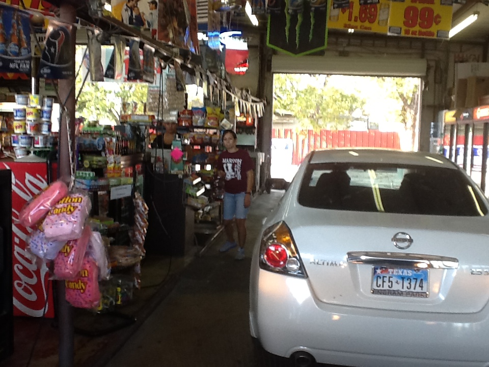 Un commerce avec seulement deux entrés de portes de garages, traversant le commerce. Dans chacune de ces portes il y a assez d’espace pour qu’un véhicule puisse y circuler, et de chaque côté du passage, se sont des armoires réfrigérés, contenant toutes les boissons imaginable, et croustilles variés.