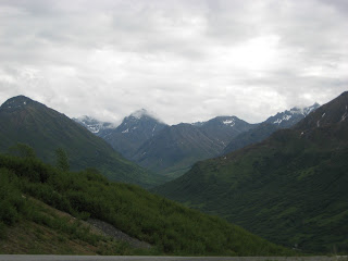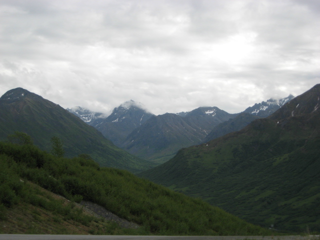 Après une bonne douche (dans une buanderie chinoise) nous repartons sur la Route 3 nord, la Glenn hwy. En quittant Palmer nous voyons le décor se dessiner devant nous, routes qui grimpent vers les montagnes enneigées, avec rivières qui serpentes dans les vallées.