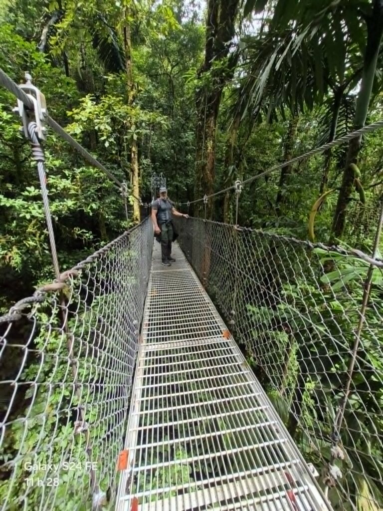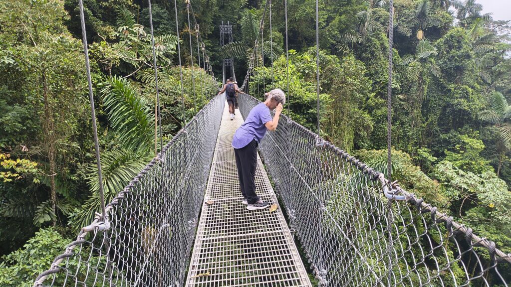 Le sentiers nous conduits à 6 ponts suspendus. Pour les traverser nous ne ressentons pas l’effet de hauteur, il y a tellement de végétation que nous ne pouvons juger de la profondeur.