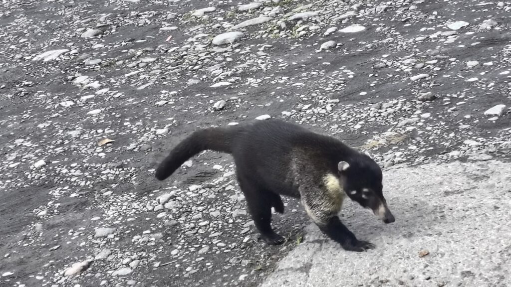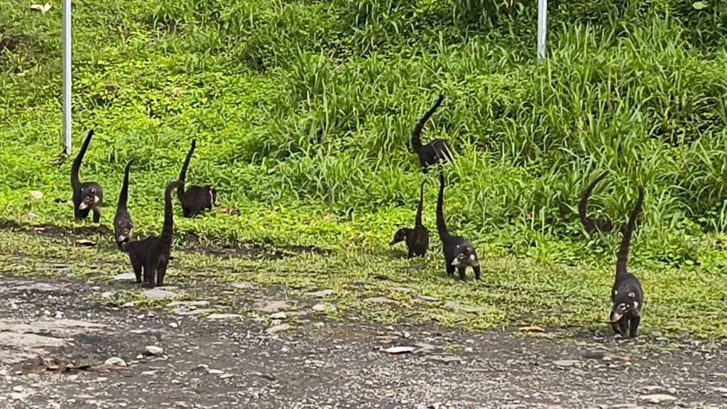 J’arrête l’auto près du barrage du lac Arenal et une dizaines de coati à nez blanche sorte de la Forêt.