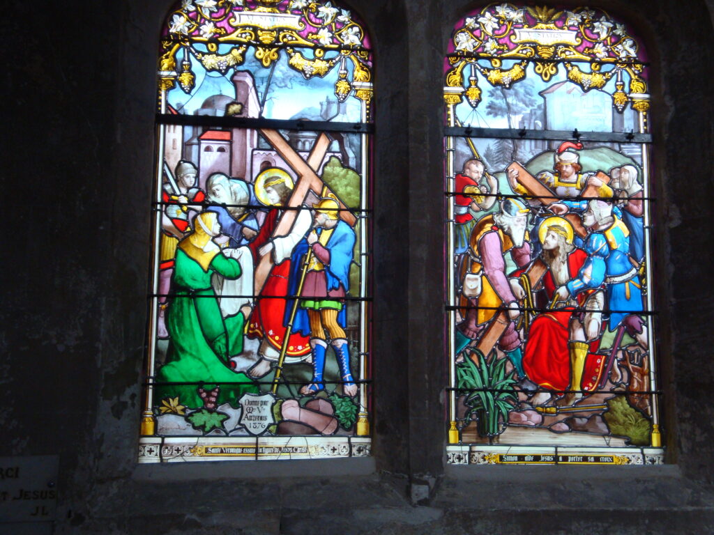 L’église Saint-Léonard est le résultat des vicissitudes de l’histoire. Elle porte les traces de sa reconstruction au 16e siècle et au 17° siècle. Le clocher octogonal date de 1760 tandis que le cycle de décor intérieur a été peint au 19e. L’intérieur de l’église est vétuste mais les vitraux sont tout simplement remarquable.