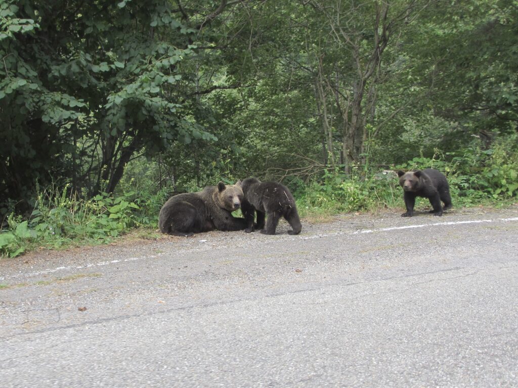 De gros ours bruns impressionnants et des petits. A croire qu’ils sont à habitués au autos, ils s’assoient sur le bord de la route et se laisse photographier, on croirait même qu’ils prennent la pose.