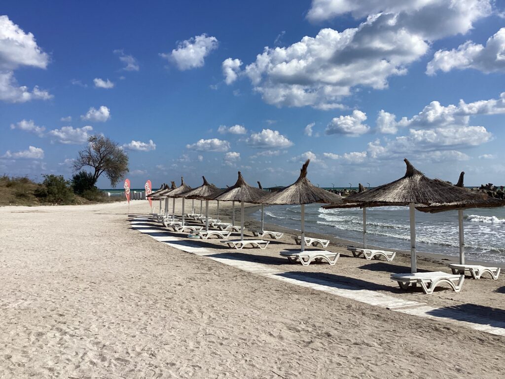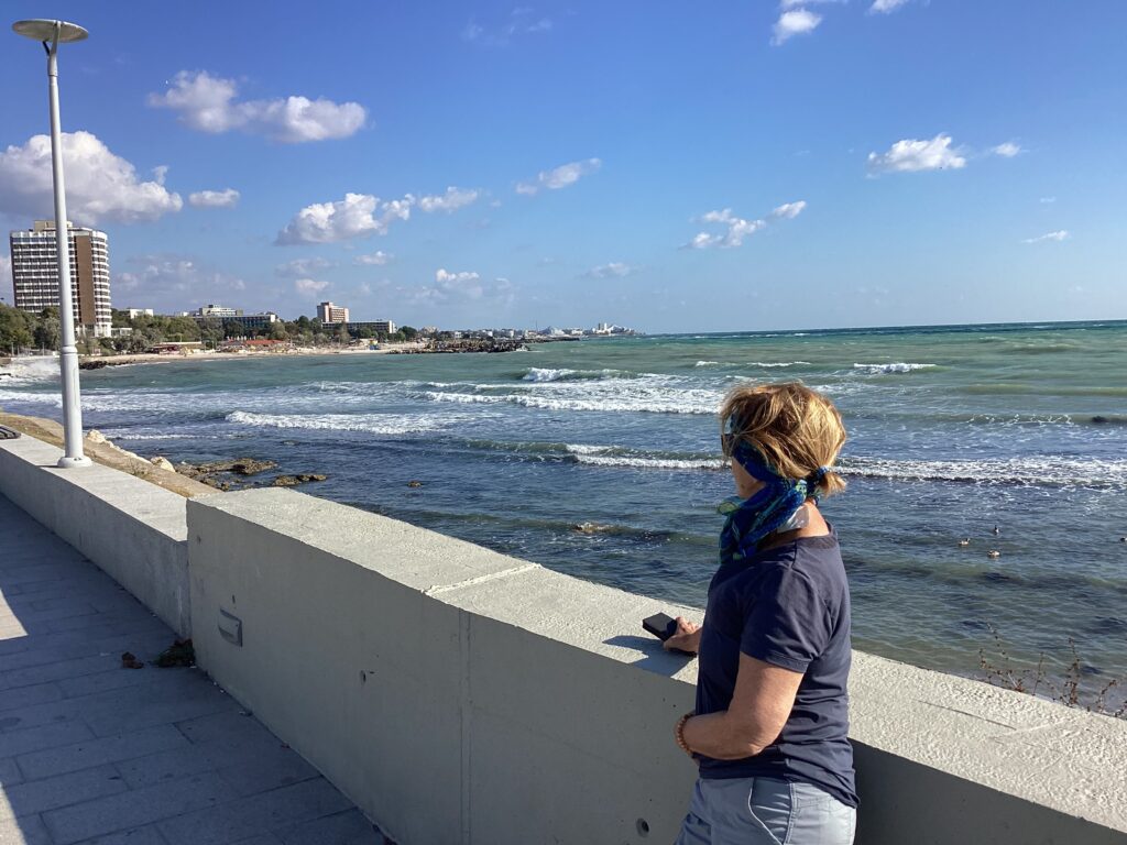 On profite de la fraîcheur du matin (il fait 24c avec de bon vent) pour faire une longue promenade sur le « boardwalk » avant de nous écraser au soleil jusqu’à 12:30hre. C’est le temps du café au seul resto-bar de la plage qui est resté ouvert.