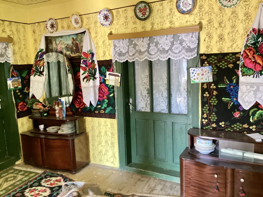 L’extérieur de sa maison est en bois et les murs intérieurs sont en terre. De la terre appliquée à la main et lissé qui deviens dur comme du ciment. De cette façon les maisons gardent la fraîcheur l’été et la chaleur l’hiver. Les murs jaunes, c’est de la tapisserie qui a été collé sur les murs de terre.