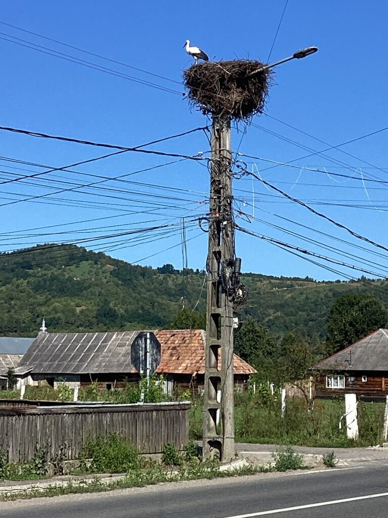 En sortant de Feresti, nous voyons une cigogne dans son nid. C’est la première que nous voyons. Souvent, dans chaque village nous voyons poteaux électriques avec d’immenses nids à leur sommets. Certains de ces poteaux sont aménagés pour accueillir des nids de cigognes,nous avons vue plusieurs nids, mais jamais de cigognes.