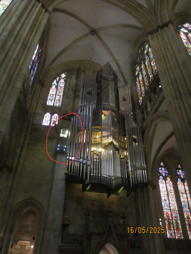 La petite boîte illuminée que l’on peut voir sur la photo, c’est l’organiste qui si trouve, il est tiré vers le haut par un treuil pour rejoindre l’orgue.