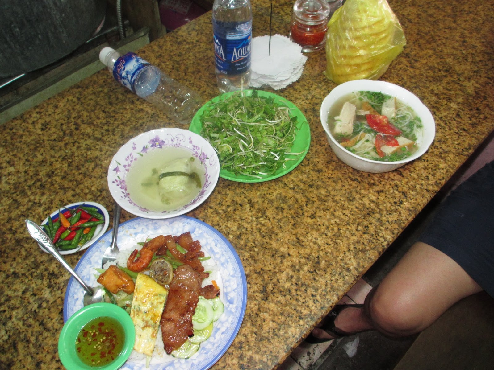 Vers l’heure du midi, nous trouvons le coins des gargotes. Les gens sembles surpris de nous y voir. Il y a de bonnes odeurs, nous décidons de manger, ici. Pour $4. Nous mangeons à satiété, même que Manon n’a pas tout mangé, il y en avait trop.