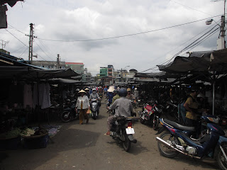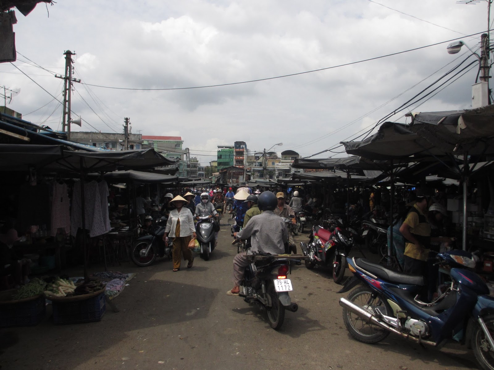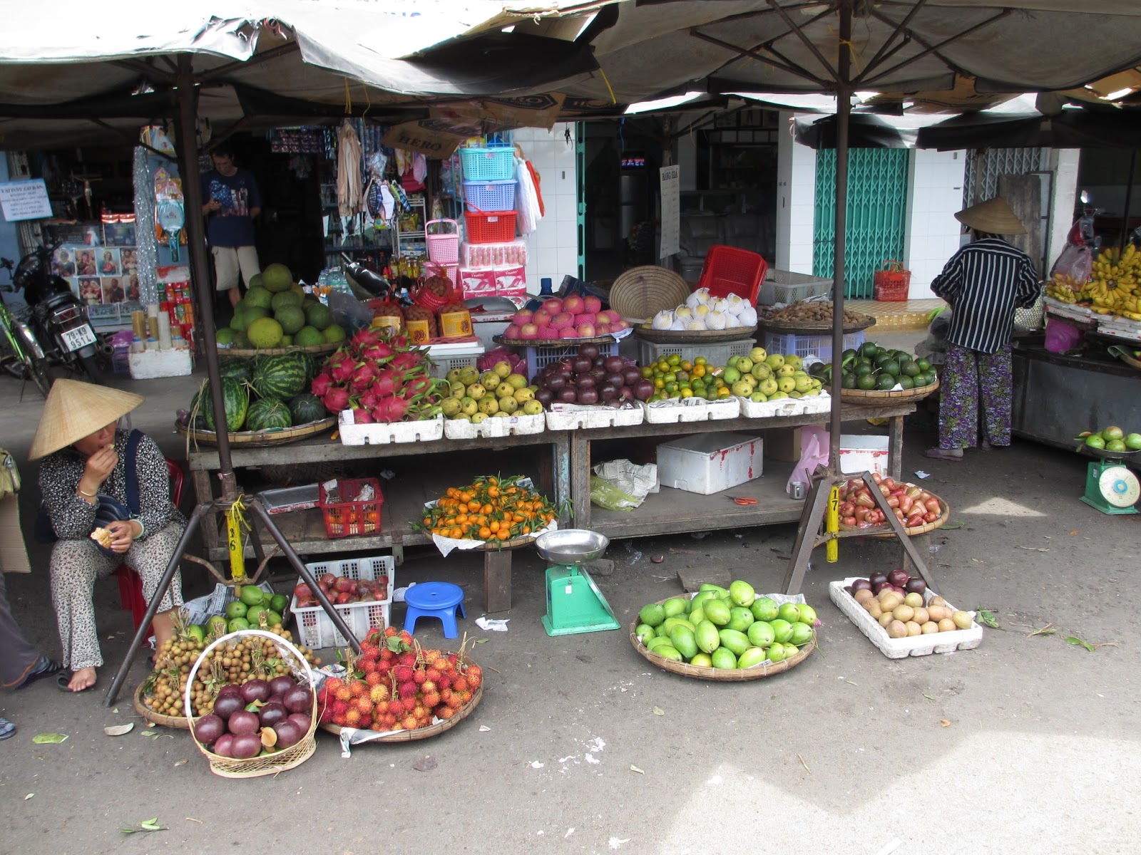 Nha Tran. On demande la direction pour leur marché local, c’est à 2.5 km de notre hôtel. Les gens sont surpris lorsqu’on leur dit que nous allons marcher, les gens semblent se déplacer le moins possible en marchant, surtout sous cette chaleur.