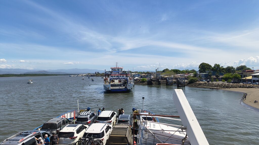 Il est 11h30 lorsque le traversier accoste à Puntarenas, y a du monde ici, ont ne s’arrête que, pour faire le plein d’essence et déguerpir au plus sacrant, ont est plus habitués à voir tant de gens, on était bien, seul dans nos cabanes.
