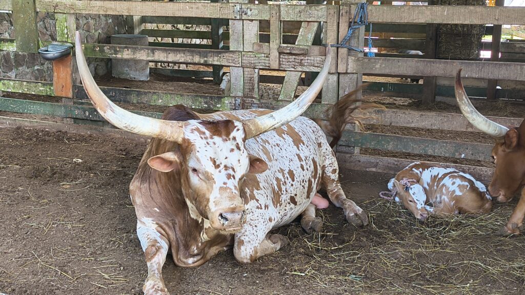 Wow, dans l’enclos il y a un couple de bovins « long Horne » avec un petit veau, ils sont impressionnants.