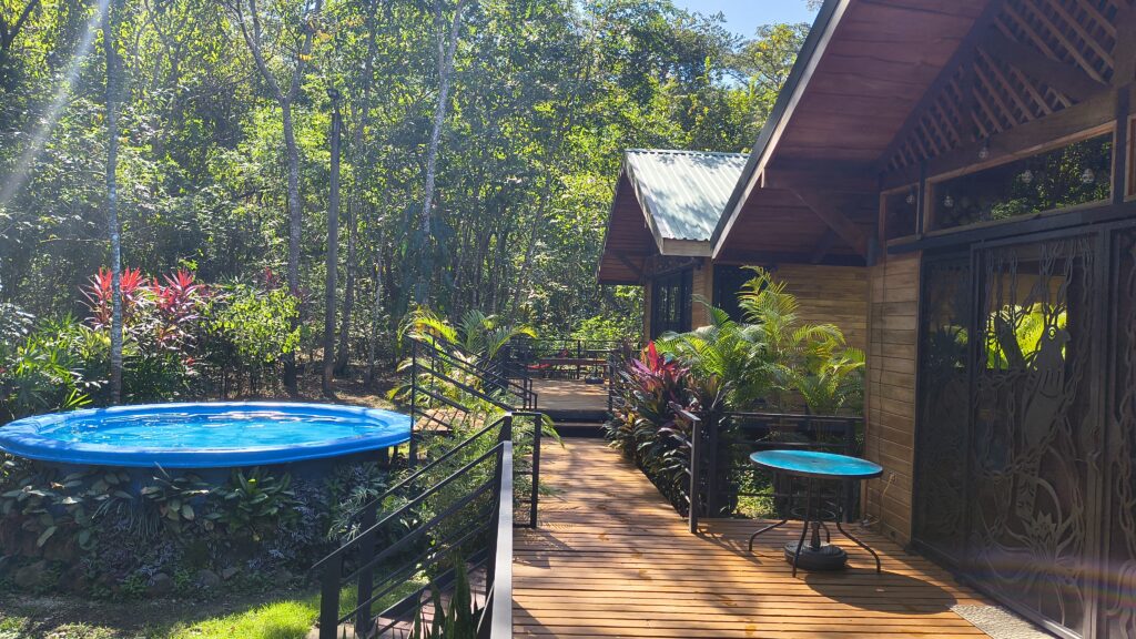 Wow, un chalet pour nous seul, grande chambre cuisine tout équipé, belle grande salle de bain et surtout la piscine (il a fait 35c aujourd’hui) et chanceux l’autre chalet est inhabité pour l’instant.