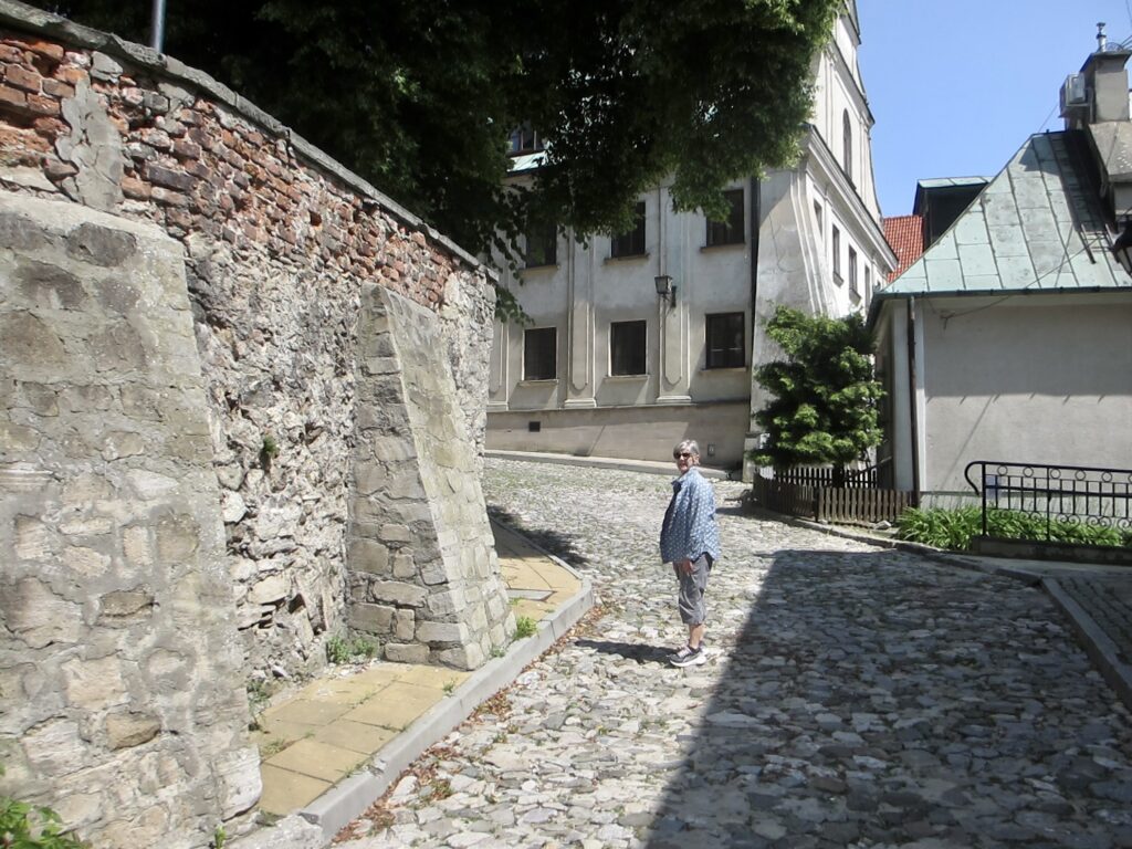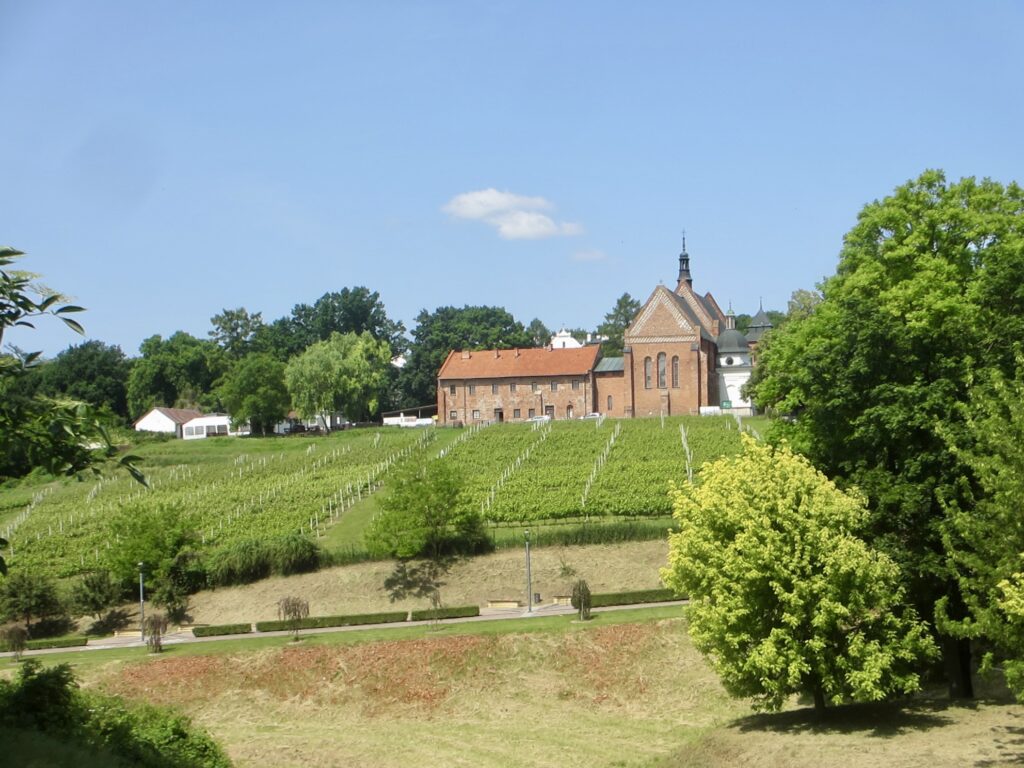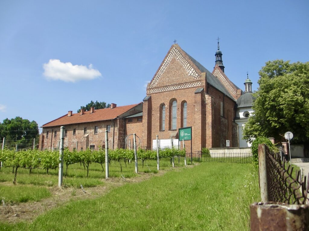 Au loin faisant face au château, derrière le champ de vignes, c’est l’église Saint Jacques une des plus anciennes églises polonaises édifiée entièrement en briques. L’ancien temple roman de la première décade du XIIIe siècle, a été construit pour les besoins du couvent des dominicains, amenés à Sandomierz par l’évêque de Cracovie.
