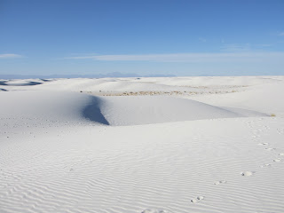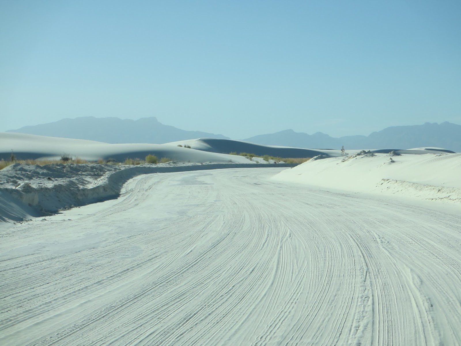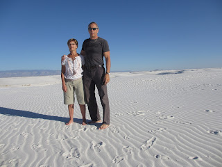 Après un tourde ville 10 minutes, on repart. Direction sud sur la route 54, rien de nouveau comme paysage, si se n’est que nous longeons pendant des milles et des milles, le terrain de jeu des militaires (y doivent jouer à la cachette, parce que j’en voie aucun). Nous arrivons a la limite du parc White Sands vers 15:00 hre. De loin nous pouvions voir quelque peu les dunes blanche, mais quand nous entrons dans ce parc et circulons parmis les dunes. C’est WOW, ces un désert de 275 milles carré de sable BLANC, vraiment blanc, on se croirait au Québec après une tempête de neige. C’est fou comme c’est beau et tout a fait nouveau pour nous. Ce sable est tellement fin et cristallisé, il est fait avec du gypsum provenant de la roche des montagnes transporté par le vent. C’est avec ce sable qu’ils fabriquent le gypse de construction. Nous marchons pieds nues sans que le sable ne nous colle aux pieds. Etrangement, malgré ce soleil de plomb le sable lui est frais.