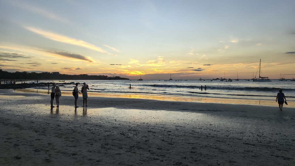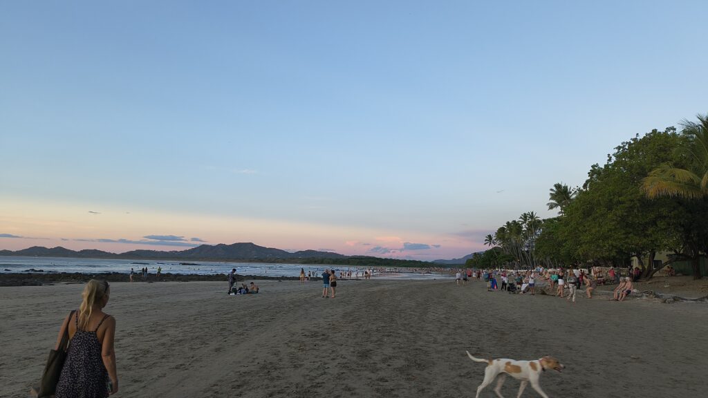 La plage de Tamarindo est une plage de sable gris, elle est très grandes et il y a foule.